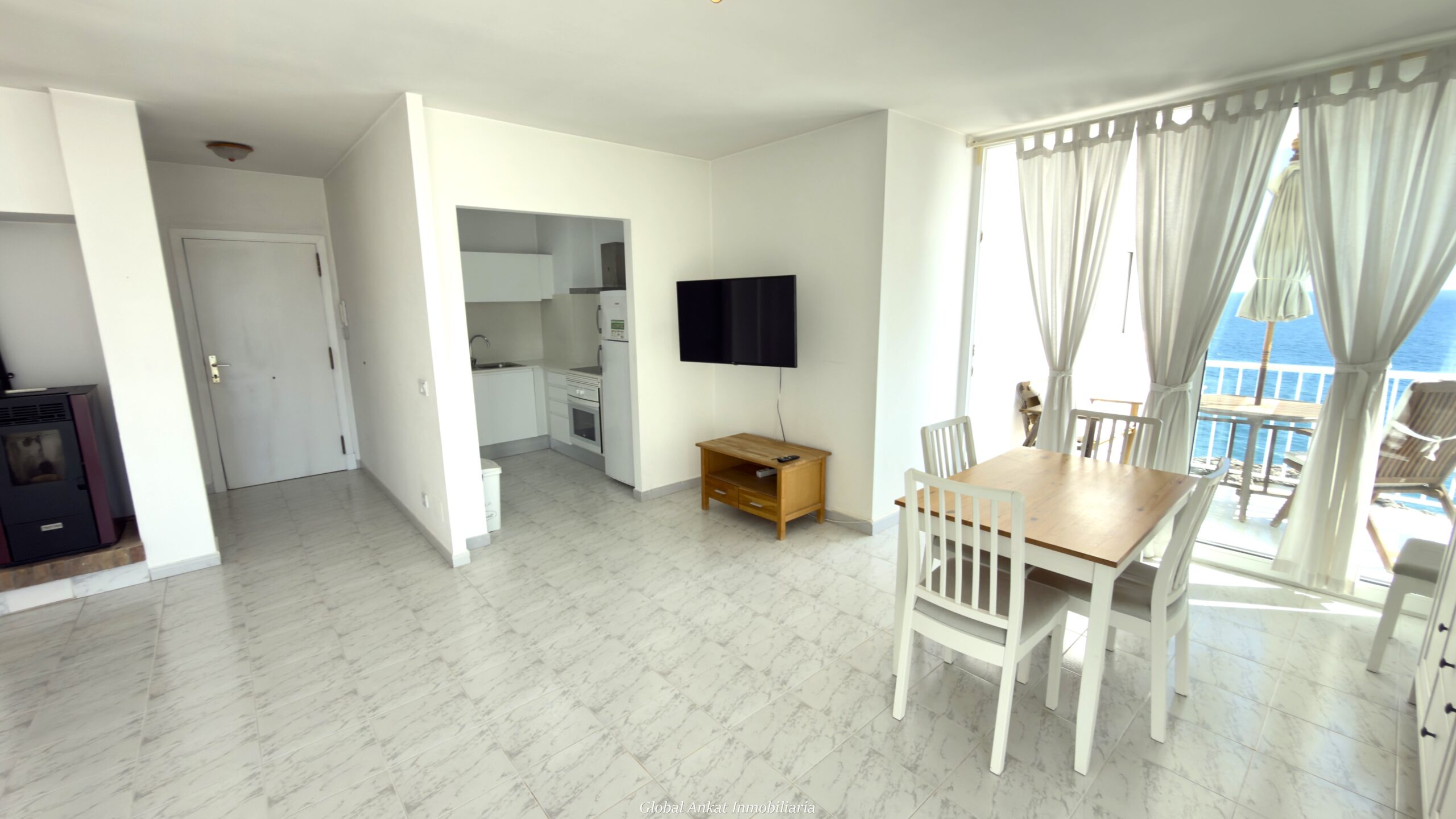 • Zona de Día: Un luminoso salón-comedor que se convierte en el corazón del hogar, equipado con una moderna chimenea de pellet, ideal para crear un ambiente acogedor en invierno. Desde aquí se accede directamente a una terraza privada con vistas frontales al mar.